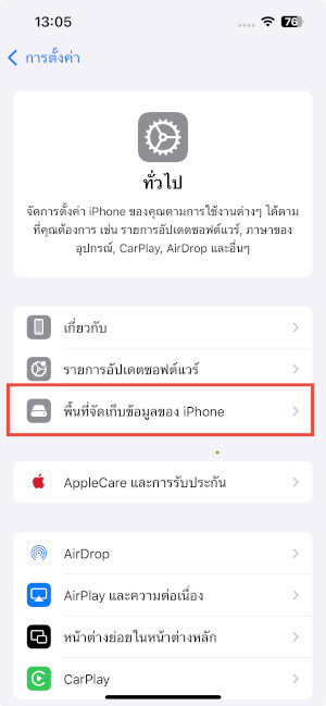 - ไปที่ การตั้งค่า (Settings) > ทั่วไป (General) > พื้นที่จัดเก็บข้อมูล iPhone (iPhone Storage)
