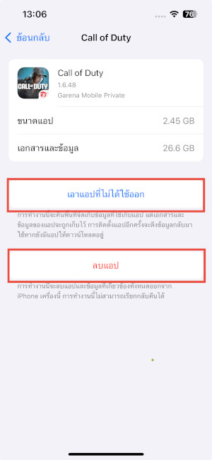 - Offload App: ลบเฉพาะไฟล์ของแอป แต่เก็บข้อมูลการล็อกอินและการตั้งค่าไว้ ตัวเลือกนี้จะช่วยให้เรากลับไปใช้แอปได้ทันทีโดยไม่ต้องล็อกอินหรือตั้งค่าใหม่