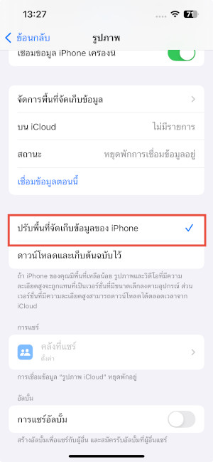 - เลือก ปรับพื้นที่จัดเก็บข้อมูล (Optimize iPhone Storage) เพื่อเก็บไฟล์คุณภาพสูงในคลาวด์ และลดขนาดไฟล์ในเครื่อง
