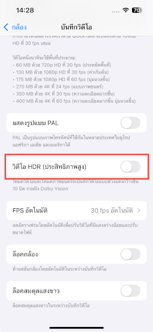 - ไปที่ การตั้งค่า (Settings) > กล้อง (Camera) > บันทึกวิดีโอ (Record Video) แล้วปิด HDR Video