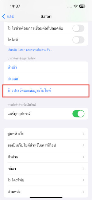 - ลบแคชของ Safari ได้ที่ การตั้งค่า (Settings) > แอป (Apps) > Safari > ล้างประวัติและข้อมูลเว็บไซต์ (Clear History and Website Data)