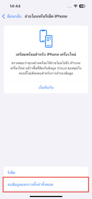 - ไปที่ การตั้งค่า (Settings) > ทั่วไป (General) > ถ่ายโอนหรือรีเซ็ต iPhone > ลบข้อมูลและการตั้งค่าทั้งหมด (Erase All Content and Settings) แล้วทำตามขั้นตอนที่ปรากฏ