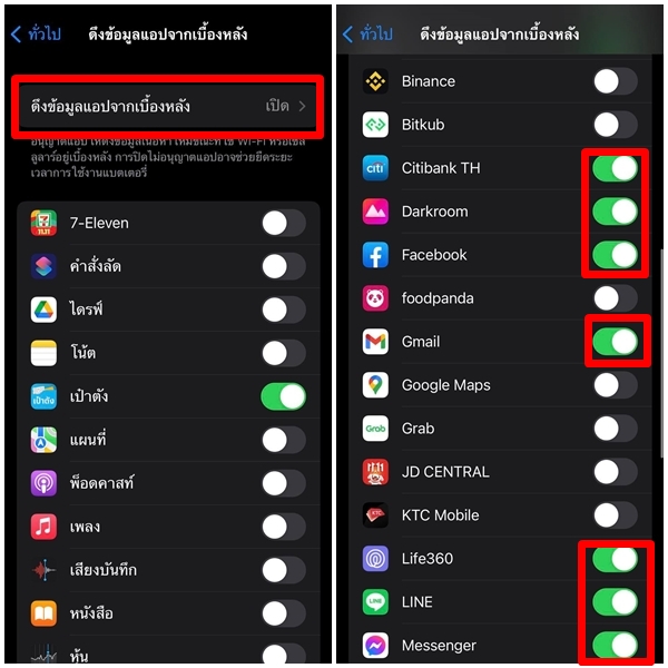 - ตรวจสอบว่า ฟีเจอร์ดึงข้อมูลแอปจากเบื้องหลังได้เปิดใช้งาน หรือไม่