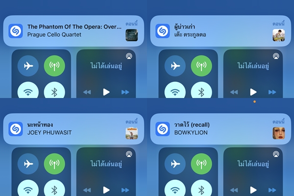 เปิดศูนย์ควบคุม (Control Center) ด้วยการปัดนิ้วจากขอบจอบนลงมา แล้วกดที่ปุ่มดังภาพ จากนั้นรอสักครู่ iPhone จะฟังเพลงที่เปิดอยู่ใกล้ ๆ ในขณะนั้น แล้วแสดงผลลัพธ์ออกมา
