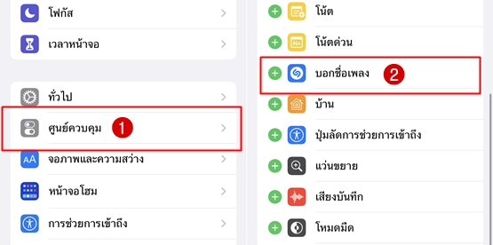 หากไม่เจอปุ่มดังกล่าวในศูนย์ควบคุม สามารถเข้าไปเพิ่มได้ที่ การตั้งค่า > ศูนย์ควบคุม เลื่อนลงมาจนเจอ บอกชื่อเพลง แล้วกด + เพียงเท่านี้ปุ่มค้นหาเพลงก็จะแสดงในศูนย์ควบคุมแล้ว