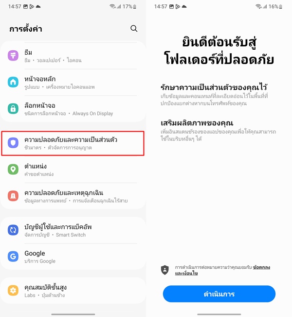 ไปที่ การตั้งค่า > ความปลอดภัยและความเป็นส่วนตัว > โฟลเดอร์ที่ปลอดภัย หากยังไม่เคยเปิดใช้งาน จะต้องตั้งรหัสความปลอดภัยก่อน โดยรหัสนี้จะไม่เกี่ยวกับรหัสล็อกหน้าจอ แนะนำว่าไม่ควรตั้งให้เหมือนกัน