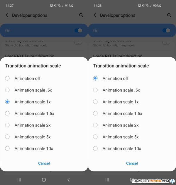 จากนั้นให้กลับมาที่หน้า Setting อีกครั้ง และเลื่อนหาคำว่า Developer option และปรับเปลี่ยนการตั้งค่าของ Window animation scale, Transition animation scale และ Animator duration scale ให้ตั้งค่าเป็น Off ทั้งหมด (ดูวิธีการตั้งค่าได้ที่นี่)