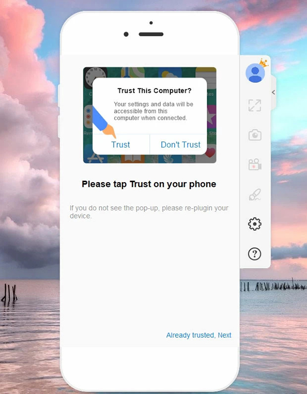 2. หากเป็นการเชื่อมต่อครั้งแรก ให้กด Trust บน iPhone แล้วมากด Already trusted, next บนคอมพิวเตอร์