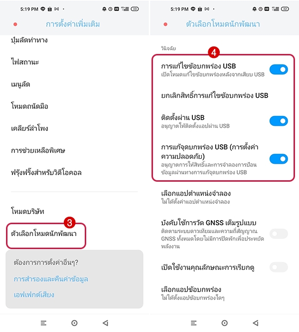 4. มองหา การแก้ไขข้อบกพร่อง USB (USB Debugging) แล้วเปิดใช้งาน