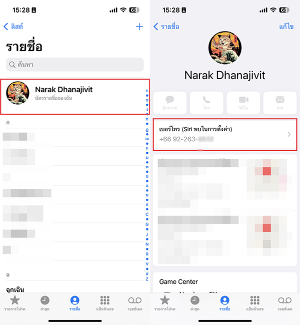 อีกวิธีหนึ่งก็ง่ายไม่แพ้กันคือการดูจากบัตรรายชื่อของตัวเอง โดยเปิดแอปโทรศัพท์ขึ้นมา เลือกแถบ รายชื่อ แล้วแตะที่ชื่อของเรา ก็จะเจอเบอร์โทรครับ