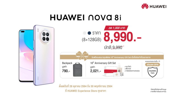 ภายในงาน หัวเว่ยยังได้ประกาศว่าเนื่องในวาระฉลองครบรอบ 10 ปีหน้าร้าน HUAWEI Experience Store จึงมอบส่วนลดมูลค่า 1,000 บาท สำหรับผลิตภัณฑ์ อาทิ HUAWEI MateBook D15 i5 (8 + 256GB) ราคา 18,990 บาท HUAWEI MateBook D15 i3 (8 + 256GB) ราคา 15,990 บาท HUAWEI nova 8i (8 + 128GB) ราคา 8,990 บาท และ HUAWEI WATCH GT 2 Pro ราคา 7,990 บาท และยังมีโปรโมชันราคาพิเศษพร้อมของสมนาคุณอีกหลากหลายผลิตภัณฑ์ ตั้งแต่วันที่ 28 ตุลาคม 2564 ถึง 30 พฤศจิกายน 2564 โดยลูกค้าที่เลือกเป็นเจ้าของผลิตภัณฑ์ที่ร่วมรายการ พิเศษรับฟรี 10th anniversary gift มูลค่า 2,021 บาท ประกอบด้วย กระเป๋าผ้า สติ๊กเกอร์ และการ์ดแสดงความขอบคุณ