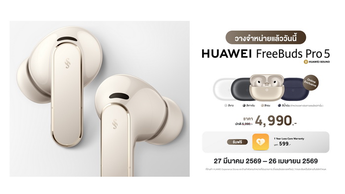 ยกระดับการฟังในทุกวัน ควบคู่กับการเติมเต็มภาพลักษณ์ที่สะท้อนตัวตนของคุณด้วย HUAWEI FreeBuds Pro 5 วางจำหน่ายแล้ววันนี้ 1 เมษายน 2569 ในราคาพิเศษ 4,990 บาท จากราคาปกติ 5,990 บาท มาพร้อม 4 สี ได้แก่ สีทอง, สีขาว, สีดำ และสีน้ำเงิน (วางขายเฉพาะออนไลน์) พิเศษ! รับทันทีการรับประกันหูฟังหาย HUAWEI Loss Care ให้ลูกค้าซื้อหูฟังข้างเดียวได้ในราคาพิเศษ 50% สามารถเคลมได้ 1 ครั้งใน 1 ปี มูลค่าความคุ้มครอง 499 บาท เมื่อสั่งซื้อผ่านหน้าร้าน HUAWEI Experience Store และร้านค้าตัวแทนจำหน่ายที่ร่วมรายการ และช่องทางออนไลน์ทั้ง HUAWEI Store, Lazada, Shopee และ TikTok Shop