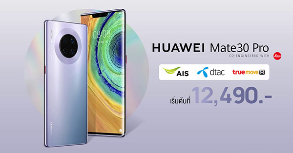 ล่าสุดนี้ทาง Huawei ประเทศไทย ได้จัดโปรโมชั่นต้อนรับปีใหม่กับ HUAWEI Mate30 Pro เรือธงตัวท็อปรุ่นล่าสุด ราคาพิเศษเริ่มต้นเพียง 12,490 บาท ผ่านทางผู้ให้บริการเครือข่ายสัญญาณโทรศัพท์มือถือรายใหญ่ของประเทศไทยทั้ง AIS, dtac และ TrueMove H ซึ่งโปรโมชั่นของแต่ละค่ายมีรายละเอียดอย่างไรบ้างนั้น ไปชมพร้อมกันเลยค่ะ