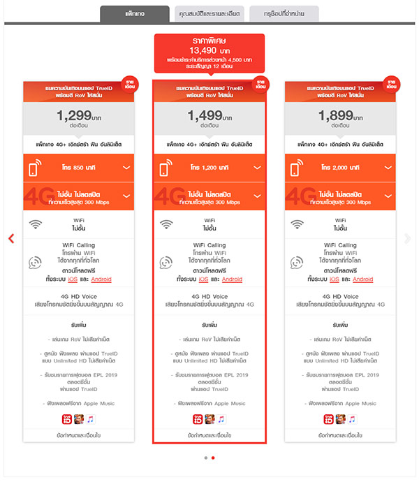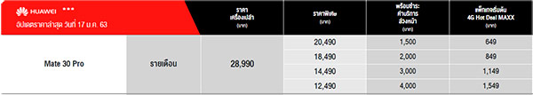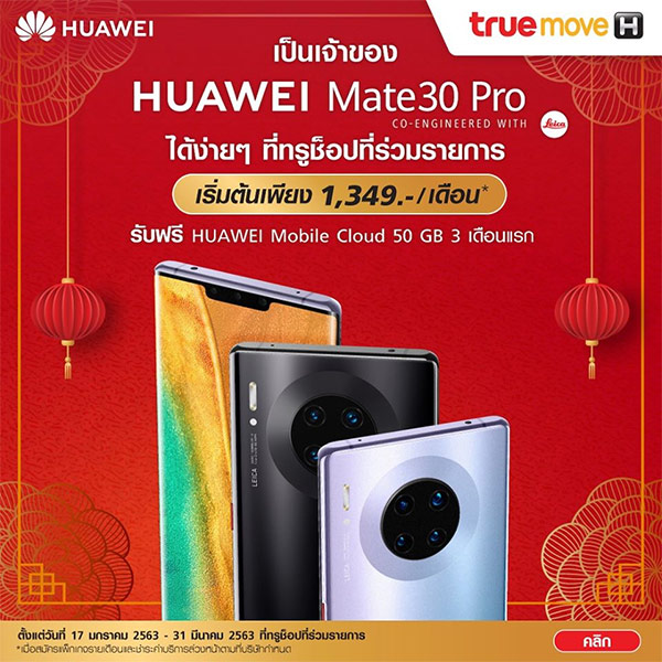 ปิดท้ายกันที่ค่าย TrueMove H กับโปรโมชั่น HUAWEI Mate30 Pro ราคาพิเศษเริ่มเพียง 13,490 บาท เมื่อสั่งซื้อตัวเครื่องพร้อมสมัครใช้งานแพ็กเกจรายเดือน 4G+ Extra Fun Unlimited 699 บาทขึ้นไป พร้อมชำระค่าบริการล่วงหน้าตามที่เงื่อนไขกำหนด (เริ่มต้นที่ 1,500 บาท) โดยมีระยะสัญญา 12 เดือน ซึ่งจะได้รับสิทธิ์เล่นเกม RoV แบบไม่เสียดาต้า, ชมภาพยนตร์ / ฟังเพลง ผ่านแอปพลิเคชัน TrueID แบบ Unlimited HD แบบไม่เสียดาต้า, ชมรายการฟุตบอล EPL 2019 ตลอดซีซั่น ผ่านแอปพลิเคชัน TrueID และฟังเพลงฟรีจาก Apple Music นานสูงสุด 6 เดือน นอกจากนี้ยังรับสิทธิ์ผ่อนชำระเริ่มเพียง 1,349 บาท/เดือน พร้อมรับฟรี HUAWEI Mobile Cloud 50GB 3 เดือนแรก