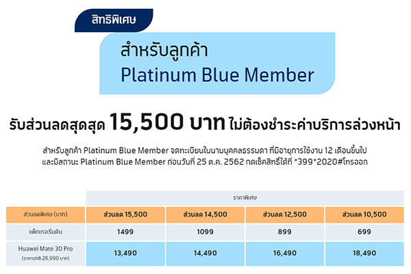 ทางด้าน dtac จัดโปรโมชั่น HUAWEI Mate30 Pro ราคาพิเศษเริ่มที่ 13,490 บาท (ปกติราคา 28,990 บาท) สำหรับลูกค้า Platinum Blue ที่มีอายุการใช้งาน 12 เดือนขึ้นไป (มีสถานะ Member ก่อนวันที่ 25 ตุลาคม 2562 : ตรวจสอบสิทธิ์ได้ที่ *399*2020#โทรออก) สามารถสั่งซื้อตัวเครื่องพร้อมสมัครใช้งานแพ็กเกจรายเดือน 699 บาทขึ้นไป โดยไม่ต้องชำระค่าบริการล่วงหน้า (ระยะสัญญา 12 เดือน)