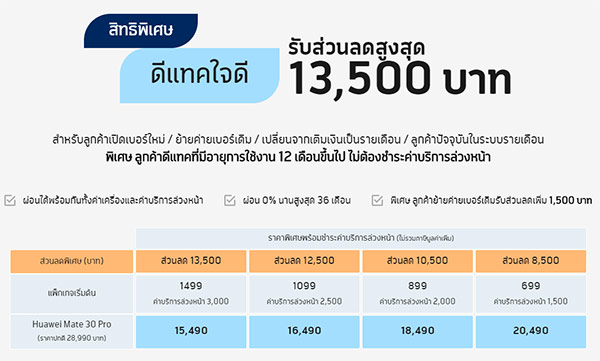 และสำหรับลูกค้าปัจจุบัน / เปิดเบอร์ใหม่ / ย้ายค่ายเบอร์เดิม / เปลี่ยนจากระบบเติมเงินเป็นรายเดือนของทาง dtac สามารถสั่งซื้อ HUAWEI Mate30 Pro ได้ในราคาเริ่มที่ 15,490 บาท (ปกติราคา 28,990 บาท) พร้อมสมัครใช้งานแพ็กเกจรายเดือน 699 บาทขึ้นไป และชำระค่าบริการล่วงหน้าตามที่เงื่อนไขกำหนด (เริ่มต้นที่ 1,500 บาท)