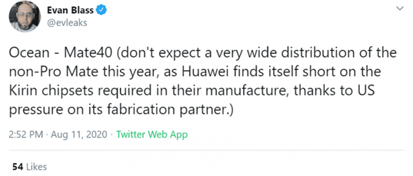 ข้อมูลดังกล่าวถูกเปิดเผยออกมาจาก Evan Blass แหล่งข่าวที่มีความน่าเชื่อถือสูงรายหนึ่งที่ได้เปิดเผยว่า สมาร์ทโฟนโค้ดเนม Ocean หรือ HUAWEI Mate40 รุ่นปกติ จะมีการวางจำหน่ายทั่วโลกแบบจำนวนจำกัด เนื่องจาก Huawei ไม่มีกำลังในการผลิตชิปเซ็ตรุ่นใหม่อย่าง Kirin 9000 ได้มากพอ รวมทั้งยังโดนมาตรการทางการค้าจากสหรัฐฯ ที่บีบบังคับไม่ให้บริษัทไอทีที่ใช้เทคโนโลยีที่มีต้นกำเนิดมาจากสหรัฐฯ ร่วมงานกับบริษัท Huawei ยกเว้นเสียว่าจะได้รับ License ซึ่งจะเห็นได้จากการที่ TSMC บริษัทผู้รับหน้าที่ผลิตชิปเซ็ตให้กับ Huawei จำเป็นต้องหยุดรับออเดอร์การผลิตชิปเซ็ตตั้งแต่ในช่วงกลางปี 2020 ที่ผ่านมา