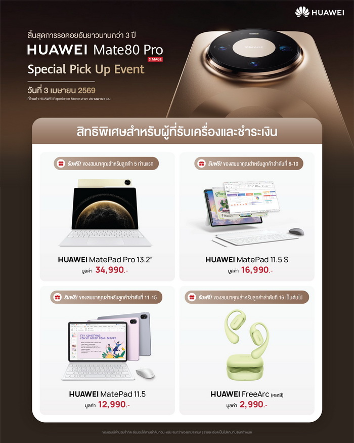 หัวเว่ย คอนซูมเมอร์ บิสสิเนส กรุ๊ป (ประเทศไทย) เตรียมจัดงาน HUAWEI Mate 80 Pro Special Pick-Up Event ในวันที่ 3 เมษายน 2569 ณ HUAWEI Experience Store สาขาสยามพารากอน เพื่อยกระดับประสบการณ์การรับเครื่องให้พิเศษยิ่งกว่าที่เคย