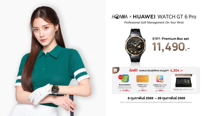 HONMA x HUAWEI WATCH GT 6 Pro วางจำหน่ายแล้ววันนี้ พร้อม Premium Box Set ที่ราคา 11,490 บาท พร้อมโปรโมชันพิเศษ เมื่อเป็นเจ้าของในช่วงโปรโมชันระหว่างวันที่ 6 กุมภาพันธ์ 2569 ถึงวันที่ 28 กุมภาพันธ์ 2569 รับทันที ของสมนาคุณสุดพิเศษ รวมมูลค่า 4,204 บาท ได้แก่ ฟีเจอร์กอล์ฟอัลติเมท มูลค่า 3,490 บาท, สิทธิ์ HUAWEI Health+ Membership มูลค่า 357 บาท และ HUAWEI WATCH Face Market VIP มูลค่า 338 บาท โดยสามารถซื้อสินค้าได้ที่หน้าร้าน HUAWEI Experience Store และร้านค้าที่ร่วมรายการ รวมถึงช่องทางออนไลน์อย่าง HUAWEI Store, Lazada, Shopee และ TikTok Shop