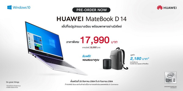 หัวเว่ยเปิดให้พรีออเดอร์แล็ปท็อป HUAWEI MateBook D 14 รุ่น 10th Gen Intel® Core™ i3 processor สี Mystic Silver ในราคาพิเศษ 17,990 บาท จากราคาปกติ 19,990 บาท พร้อมรับของสมนาคุณสุดคุ้มได้แก่ กระเป๋าเป้สะพายหลัง มูลค่า 1,090 บาท และลำโพง HUAWEI Mini Speaker มูลค่า 1,090 บาท ทั้งหมดมูลค่ารวม 2,180 บาท เมื่อพรีออเดอร์ตั้งแต่วันที่ 25 สิงหาคม 2564 ถึง 8 กันยายน 2564 เฉพาะช่องทางออนไลน์เท่านั้นที่ Shopee, Lazada และ HUAWEI Store โดย HUAWEI MateBook D 14 รุ่น 10th Gen Intel® Core™ i3 processor จะพร้อมวางจำหน่ายอย่างเป็นทางการในวันที่ 9 กันยายน 2564 เป็นต้นไป