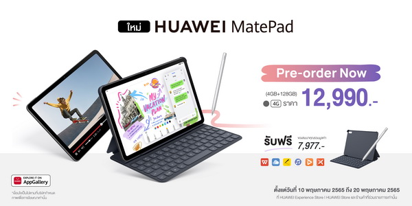 HUAWEI MatePad 10.4-inch 2022 (4GB+128GB) 4G จะวางจำหน่ายในสี Matte Grey ราคา 12,990 บาท โดย พรีออเดอร์ได้ตั้งแต่วันที่ 10 พฤษภาคม 2565 – 20 พฤษภาคม 2565 รับทันที HUAWEI Smart Keyboard (มูลค่า 2,290 บาท) และ HUAWEI M-Pencil Package 2nd generation (มูลค่า 4,490 บาท) และสิทธิประโยชน์อีกมากมาย สำหรับลูกค้า HUAWEI Mobile Service และแอปพลิเคชันต่างๆ (มูลค่ารวม 1,197 บาท) รวมมูลค่าทั้งหมด 7,977 บาท สามารถสั่งจองได้ผ่านหน้าร้าน HUAWEI Experience Store และร้านค้าตัวแทนจำหน่ายที่ร่วมรายการ รวมถึงช่องทางออนไลน์อย่างเว็บไซต์ HUAWEI Store ร้านค้าอย่างเป็นทางการของหัวเว่ยบนแอปพลิเคชัน Shopee, Lazada, JD Central และ Thisshop และแอปพลิเคชัน My HUAWEI