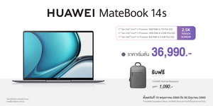- HUAWEI MateBook 14 11th Gen Intel® Core™ i5 (16GB+512GB) หน้าจอทัชสกรีน สี Space Grey ราคา 34,990 บาท รับฟรีของสมนาคุณพิเศษได้แก่ HUAWEI Normal Backpack และ HUAWEI Premium Mouse รวมมูลค่า 2,580 บาท