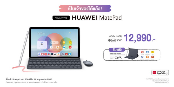 นอกจากประสิทธิภาพและคุณสมบัติของดีไวซ์แล้ว เรื่องของราคาและข้อเสนอก็เป็นสิ่งที่ไม่ควรมองข้าม สำหรับHUAWEI MatePad 10.4-inch 2022 จัดเต็มให้ทั้งซอฟต์แวร์และฮาร์ดแวร์ในราคาที่เหมาะสมพร้อมกับประหยัดเงินซื้ออุปกรณ์เสริมไปในตัว หากใครสนใจอยากได้แท็ปเล็ตสักเครื่องที่ให้ประสบการณ์ไม่ต่างจากการใช้งานพีซีและพร้อมลุยงานไปกับคุณทุกๆ ที่ ก็พลาดไม่ได้ HUAWEI MatePad 10.4-inch 2022 (4GB+128GB) 4G มาในสี Matte Grey ราคา 12,990 บาท รับฟรี HUAWEI Smart Keyboard (มูลค่า 2,290 บาท) และ HUAWEI M-Pencil Package 2nd generation (มูลค่า 4,490 บาท) พร้อมสิทธิประโยชน์อีกมากมายสำหรับลูกค้า HUAWEI Mobile Service และแอปพลิเคชันต่างๆ (มูลค่ารวม 1,197 บาท) รวมมูลค่าทั้งหมด 7,977 บาท เมื่อซื้อตั้งแต่วันที่ 21 พฤษภาคม 2565 – 31 พฤษภาคม 2565 (ของสมนาคุณมีจำนวนจำกัด) เป็นเจ้าของได้แล้ววันนี้ที่ HUAWEI Experience Store และร้านค้าตัวแทนจำหน่ายที่ร่วมรายการ รวมถึงช่องทางออนไลน์อย่างเว็บไซต์ HUAWEI Store ร้านค้าอย่างเป็นทางการของหัวเว่ยบนแอปพลิเคชัน Shopee, Lazada, JD Central และ Thisshop และแอปพลิเคชัน My HUAWEI