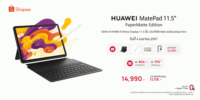 บอกโปร HUAWEI MatePad 11.5 PaperMatte Edition แท็บเล็ตครบเซ็ตสำหรับมนุษย์ออฟฟิศ เปิดขาย 4.4 นี้ ในราคาต่ำสุดเพียง 11,118 บาท[1] จากปกติ 14,990 บาท เมื่อใช้ร่วมกับราคาพิเศษบน Flash Sale รอบ 00:00 น. เหลือเพียง 13,880 บาท และใช้โค้ดจากหัวเว่ย ลดเพิ่ม 800 บาท พิมพ์ HWFBPM04 และใช้โค้ดจาก Shopee ลดเพิ่ม 15% สูงสุด 2,000 บาท ไม่มีขั้นต่ำ พิมพ์ 15MALL44 และโปรโมชันบัตรเครดิตผ่อน 0% สูงสุด 10 เดือน นอกจากนี้ยังรับฟรี ปากกา HUAWEI M-Pencil Package มูลค่า 4,490 บาท เคสคีย์บอร์ด HUAWEI Smart Keyboard มูลค่า 4,990 บาท กล่องเก็บของแบบพับได้ มูลค่า 1,990 บาท และกระเป๋า มูลค่า 790 บาท ที่ร้านค้าอย่างเป็นทางการของหัวเว่ยบน Shopee