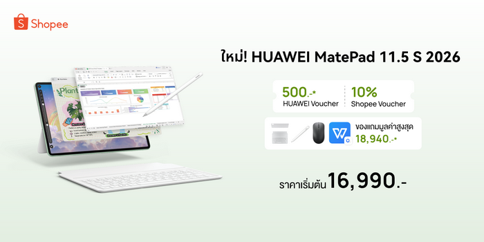 หัวเว่ยร่วมกับ Shopee จัดโปรฯ 2 ต่อ! เป็นเจ้าของแท็บเล็ต HUAWEI MatePad 11.5 S 2026 ในราคาเพียง 16,990 บาท ฟรี! ของแถมมูลค่าสูงสุด 19,339 บาท