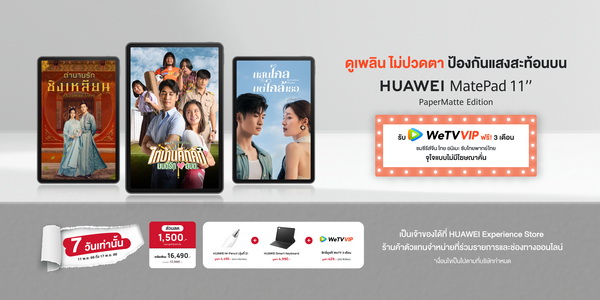 พิเศษ! สำหรับลูกค้าใหม่ 300 สิทธิ์แรก ที่สั่งซื้อ HUAWEI MatePad 11” PaperMatte Edition ระหว่างวันที่ 11 พฤศจิกายน 2566 ถึง 17 พฤศจิกายน 2566 รับสิทธิพิเศษทันที WeTV VIP 3 เดือน มูลค่า 429 บาท สามารถดูคอนเทนต์ VIP ได้แบบเต็มเรื่อง (Full EP) ดูคอนเทนต์ใหม่ในแต่ละสัปดาห์ได้มากกว่า (Watch more) และดูคอนเทนต์ทั้งหมดได้แบบไม่มีโฆษณาคั่น แถมรับส่วนลดพิเศษ 1,500 บาท เหลือเพียง 16,490 บาท จากราคาปกติ 17,990 บาท พร้อมรับฟรี ปากกา HUAWEI-M Pencil รุ่นที่ 2 มูลค่า 4,490 บาท (แถมมาในกล่อง) เคสคีย์บอร์ด HUAWEI Smart Keyboard มูลค่า 4,990 บาท