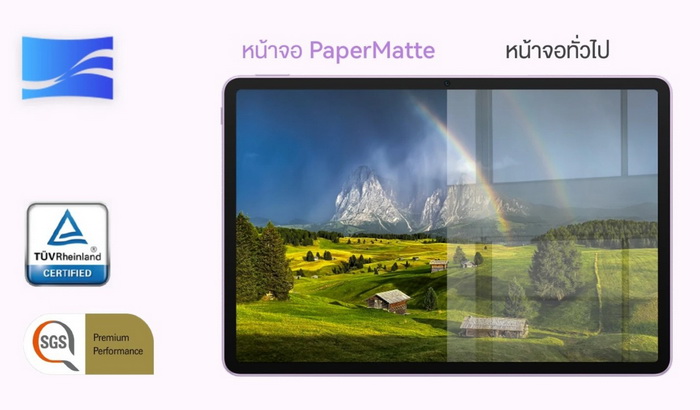 จอภาพ HUAWEI FullView Display ขนาด 11.5 นิ้ว ความละเอียด 2.5K มอบประสบการณ์รับชมที่กว้างเต็มตา ด้วยความสว่างสูงสุด 600-nit และอัตรารีเฟรช 120 Hz ที่ลื่นไหล นอกจากนี้ ยังมาพร้อมเทคโนโลยีถนอมสายตา อาทิ PaperMatte Display และ Natural Light-like Display ซึ่งช่วยลดแสงสะท้อนและแสงจ้า มอบความรู้สึกสบายตาใกล้เคียงกับการอ่านบนกระดาษจริง จนได้การรับรองจาก TÜV Rheinland ในด้าน Low Blue Light และ Flicker-Free ช่วยปกป้องดวงตาแม้ใช้งานในระยะเวลานาน ในด้านระบบเสียงมาพร้อมลำโพง 4 ตัว และเทคโนโลยี Histen 9.0 ไม่ว่าจะเป็นการเรียนออนไลน์ ดูหนังฟังเพลง หรือการเล่นเกม จึงเต็มอรรถรสด้วยมิติเสียงที่คมชัดและสมจริง