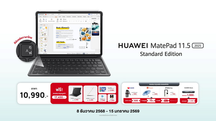 HUAWEI MatePad 11.5 2025 (Standard Edition) พร้อมให้คุณเป็นเจ้าของแล้ววันนี้ ในราคาเพียง 10,990 บาท เฉพาะช่องทางออนไลน์เท่านั้น เมื่อสั่งซื้อตั้งแต่วันที่ 8 ธันวาคม 2568 – 15 มกราคม 2569 รับทันทีของสมนาคุณมูลค่ารวม 17,450 บาท ได้แก่ HUAWEI Smart Keyboard มูลค่า 4,990 บาท, HUAWEI M-Pencil (รุ่นที่ 3) มูลค่า 4,490 บาท, ติดตั้งแอปพลิเคชันฟรี ได้แก่ PC-Level WPS Office 2.0 มูลค่า 3,990 บาท, HUAWEI Notes มูลค่า 1,990 บาท และ GoPaint มูลค่า 1,990 บาท มอบอีกต่อกับของสมนาคุณสำหรับแต่ละแพลตฟอร์ม โดยเมื่อซื้อผ่าน Lazada รับกระบอกน้ำสแตนเลส มูลค่า 390 บาท ซื้อผ่าน Shopee รับฟรี ร่มสีเงิน มูลค่า 490 บาท ซื้อผ่าน TikTok Shop รับกระเป๋าผ้ามูลค่า 790 บาท และหากซื้อผ่าน HUAWEI Store รับทันทีส่วนลด 1,000 บาท เมื่อวางมัดจำเพียง 1 บาทเท่านั้น