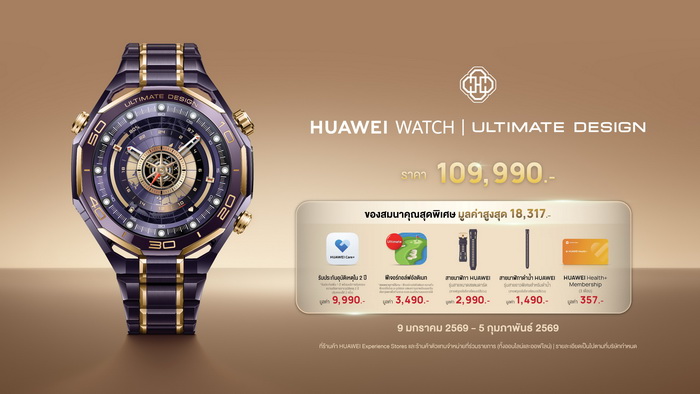 HUAWEI WATCH ULTIMATE DESIGN Royal Gold นาฬิการะดับอัลติเมตลักชัวรีที่เลือกใช้วัสดุขั้นสูง เตรียมวางจำหน่ายในประเทศไทยวันที่ 9 มกราคม 2569 ที่ราคา 109,990 บาท พิเศษ! รับของสมนาคุณมูลค่าสูงสุด 18,317 บาท ได้แก่ HUAWEI Care+ รับประกันอุบัติเหตุใน 2 ปี มูลค่า 9,990 บาท, ฟีเจอร์กอล์ฟอัลติเมทตลอดอายุการใช้งาน มูลค่า 3,490 บาท, สายนาฬิกา HUAWEI รุ่นสายขนาดสแตนดาร์ด มูลค่า 2,990 บาท, สายนาฬิกาดำน้ำ HUAWEI รุ่นสายยาวพิเศษสำหรับดำน้ำ มูลค่า 1,490 บาท และ HUAWEI Health+ Membership ระยะเวลา 3 เดือน มูลค่า 357 บาท (เงื่อนไขและรายละเอียดเป็นไปตามที่บริษัทกำหนด) เมื่อซื้อระหว่างวันที่ 9 มกราคม 2569 ถึงวันที่ 5 กุมภาพันธ์ 2569 ผ่านหน้าร้าน HUAWEI Experience Store และร้านค้าตัวแทนจำหน่ายที่ร่วมรายการ รวมถึงร้านค้าอย่างเป็นทางการบนช่องทางออนไลน์ทั้ง HUAWEI Store, Lazada, Shopee และ TikTok Shop