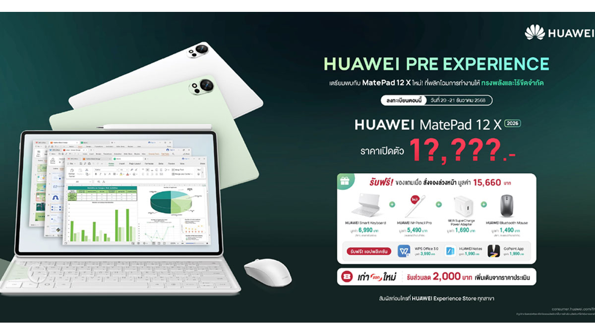 หัวเว่ย คอนซูมเมอร์ บิสสิเนส กรุ๊ป (ประเทศไทย) เปิดตัว HUAWEI MatePad 12 X (2026) สุดยอดแท็บเล็ตเรือธงรุ่นใหม่ล่าสุด ที่พร้อมที่ยกระดับประสบการณ์การใช้งานระดับพีซีไปอีกขั้น ก้าวข้ามขีดจำกัดการทำงานในยุคปัจจุบัน ด้วยความคมชัดเหนือระดับด้วย Ultra-Clear PaperMatte Display เพิ่มขีดความสามารถในการทำงานสูงสุดด้วย PC-level WPS Office 3.0 และจินตนาการไม่รู้จบที่รังสรรด้วย HUAWEI M-Pencil Pro HUAWEI MatePad 12 X (2026) พร้อมเป็นผู้ช่วยคู่ใจให้มืออาชีพและนักสร้างสรรค์ในยุคปัจจุบันและปลดล็อกศักยภาพได้อย่างเต็มที่ พร้อมข้อเสนอพิเศษมากมาย นอกจากนี้ยังเตรียมพบกับกิจกรรมสุดพิเศษ “HUAWEI VIP Preview: Pre-Experience & Discover HUAWEI” ระหว่างวันที่ 20 ธันวาคม 2568 - 21 ธันวาคม 2568 ณ HUAWEI Authorized Experience Store 8 สาขาทั่วกรุงเทพฯ และปริมณฑล สัมผัสประสบการณ์การใช้งานจริงของแท็บเล็ตเรือธงรุ่นใหม่ก่อนการวางจำหน่ายอย่างเป็นทางการพร้อมกัน