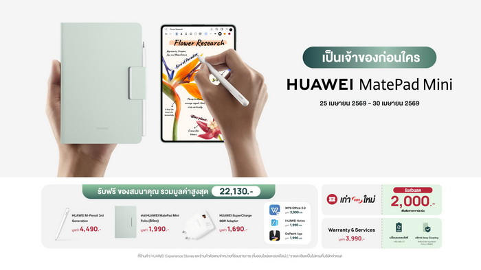 HUAWEI MatePad Mini เตรียมเปิดให้พรีออเดอร์เป็นเจ้าของก่อนใคร ตั้งแต่วันที่ 25 เมษายน 2569 ถึง 30 พฤษภาคม 2569 พร้อมรับสิทธิพิเศษและของสมนาคุณรวมมูลค่าสูงสุด 22,130 บาท ได้แก่ HUAWEI M-Pencil 3rd Generation มูลค่า 4,490 บาท, เคส HUAWEI MatePad Mini Folio สีเขียว มูลค่า 1,990 บาท, HUAWEI SuperCharge 66W Adapter มูลค่า 1,690 บาท พร้อมแอปพลิเคชันที่ติดตั้งมาให้ใช้งานฟรี ได้แก่ WPS Office 3.0 มูลค่า 3,990 บาท, HUAWEI Notes มูลค่า 1,990 บาท และ GoPaint App มูลค่า 1,990 บาท
