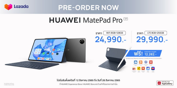 แน่นอนว่าทุกแอปพลิเคชันที่กล่าวมานี้ สามารถดาวน์โหลดมาใช้ได้ทันทีโดยไม่เสียค่าใช้จ่ายใน HUAWEI AppGallery หนึ่งในสามตลาดแอปพลิเคชันที่ใหญ่ที่สุดในโลก โดย HUAWEI MatePad Pro 11-inch มาในสี Golden Black รุ่น WIFI (8 GB+128GB) ราคา 24,990 บาท และรุ่น LTE (8GB+256GB) ราคา 29,990 บาท หากใครสนใจสามารถสั่งจองได้แล้ววันนี้พร้อมรับโปรโมชันสุดคุ้มในช่วงพรีออเดอร์ รับฟรี! HUAWEI Smart Magnetic Keyboard, HUAWEI M-pencil 2nd generation และสิทธิประโยชน์มากมายจาก HUAWEI AppGallery อาทิ บริการ HUAWEI Cloud ฟรี 3 เดือน บริการ HUAWEI Music ฟรี 3 เดือน บริการ HUAWEI Video ฟรี 1 เดือน ใช้งาน WPS Office ฟรี 3 เดือนรวมถึงรับ Lazada Voucher มูลค่า 50 บาท เป็นต้น รวมมูลค่าของสมนาคุณ 12,282 บาท เมื่อสั่งจองระหว่างวันที่ 12 สิงหาคม 2565 ถึงวันที่ 26 สิงหาคม 2565 ผ่านหน้าร้าน HUAWEI Experience Store และร้านค้าตัวแทนจำหน่ายที่ร่วมรายการ รวมถึงช่องทางออนไลน์อย่างเว็บไซต์ HUAWEI Store ร้านค้าอย่างเป็นทางการของหัวเว่ยบน แอปพลิเคชัน Lazada