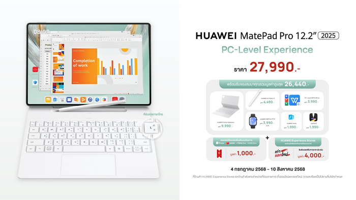 HUAWEI MatePad Pro 12.2” 2025 พร้อมเปิดให้พรีออเดอร์แล้วตั้งแต่ 4 กรกฎาคม 2568 – 10 กรกฎาคม 2568 ในราคา 27,990 บาท พร้อมของแถมมูลค่าสูงสุด 26,440 บาท ประกอบด้วย HUAWEI Glide Keyboard มูลค่า 9,990 บาท HUAWEI M-Pencil (รุ่นที่ 3) มูลค่า 4,490 บาท แอป PC-Level WPS Office มูลค่า 3,990 บาท HUAWEI WATCH FIT 3 (คละสี) มูลค่า 3,990 บาท แอป HUAWEI Notes มูลค่า 1,990 บาท แอป GoPaint มูลค่า 1,990 บาท