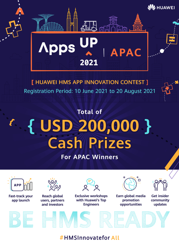 กรุงเทพมหานคร 14 มิถุนายน 2564 - Huawei Mobile Services (HMS) เปิดตัว AppsUP 2021 การประกวดนวัตกรรมแอปพลิเคชันมือถือระดับโลกประจำปี สำหรับการแข่งขันในภูมิภาคเอเชียแปซิฟิก (APAC) ประจำปีนี้ ผู้เข้าร่วมแข่งขันทั่วภูมิภาคจะได้แสดงทักษะและความสามารถเพื่อคว้าเงินรางวัลรวม 200,000 ดอลลาร์สหรัฐ หรือประมาณ 6,000,000 บาท ผู้ที่สนใจสามารถลงทะเบียนเข้าร่วมได้ตั้งแต่วันที่ 10 มิถุนายน ถึง 20 สิงหาคมนี้
