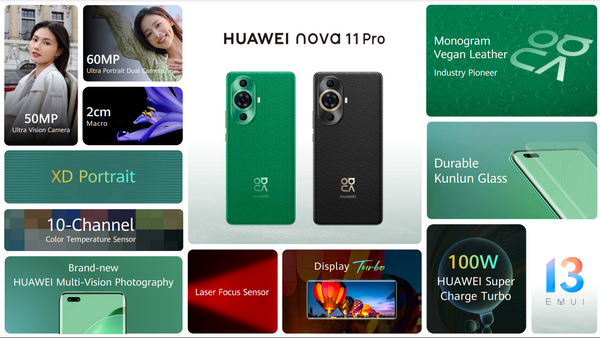 สเปกแบบเรือธงหน้าจอแข็งแกร่งด้วยกระจก Kunlun Glass อีกทั้งยังมีเทคโนโลยี Display Turbo แสดงผลภาพถ่ายและวิดีโอ HDR และคุณภาพระดับ Ultra-HD Pro ดีไซน์นำแฟชั่นด้วยลวดลายแบบหนัง nova Monogram Vegan Leather Design ใช้งานต่อเนื่องรองรับการชาร์จไว 100W HUAWEI SuperCharge Turbo ชาร์จเต็มในเวลาเพียง 20 นาที[1] เมื่อปิดหน้าจอ หรือถึง 50% ในเวลาเพียง 15 นาทีเมื่อเปิดหน้าจอ [2]