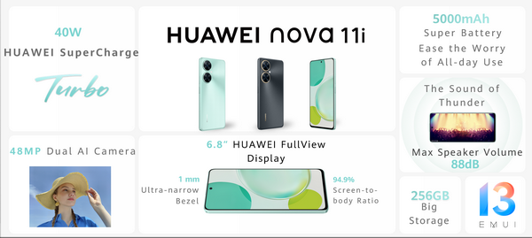 HUAWEI nova 11i มาในหน่วยความจำขนาดจุใจ 256 GB ไม่ว่าจะคอนเทนต์แบบไหนจัดเก็บได้สบายๆ ไม่ว่าจะเป็นเพลงความละเอียดสูงได้ที่สามารถจัดเก็บได้มากถึง 20,000 เพลง และหนังความละเอียดสูงพิเศษกว่า 140 เรื่อง หน้าจอใหญ่ HUAWEI FullView Display ขนาด 6.8 นิ้ว และขอบบางพิเศษขนาด 1 มม. ที่ให้อัตราส่วนหน้าจอต่อตัวเครื่องสูงถึง 94.9% ระดับเสียงลำโพงสูงสุดที่เพิ่มเป็น 88 dB พร้อมเทคโนโลยี Histen 8.1 ที่ปรับแต่งอย่างมืออาชีพเพื่อมอบโน้ตเสียงเบสที่หนักแน่น เสียงกลางที่ชัดเจน ช่วงไดนามิกที่ดีขึ้น
