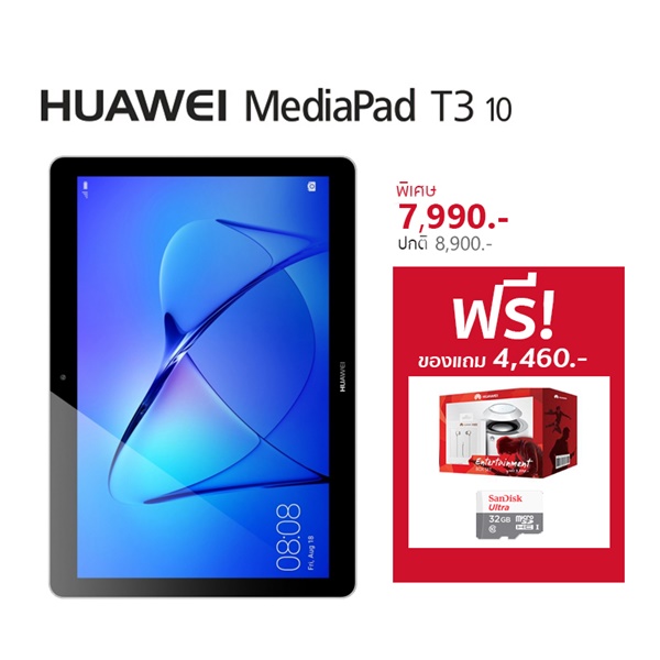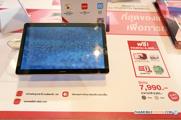 นอกเหนือจากสมาร์ทโฟนแล้ว ภายในงาน TME 2018 ทาง Huawei ยังได้มีการนำเอาแท็ปเล็ตรุ่นเด่นมาจัดโปรโมชันพิเศษด้วย อย่างในรุ่น Huawei MediaPad T3 แท็ปเล็ตสเปกเครื่องพร้อมจอไซส์ใหญ่ 9.6 นิ้ว ที่ลดราคาพิเศษเหลือเพียง 7,990 บาท จากราคาปกติ 8,900 บาท โดยผู้ที่สั่งซื้อภายในงานจะได้รับของแถมพิเศษมูลค่ารวมกว่า 4,460 บาท ได้แก่ Entertainment Box Set และ microSD Card ความจุ 32GB พร้อมรับสิทธิ์ผ่อนชำระค่าเครื่องแบบ 0% และรับเครดิตเงินคืนจากสถาบันการเงินที่ร่วมรายการ