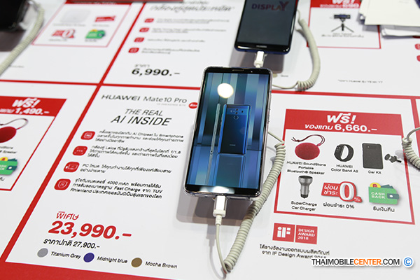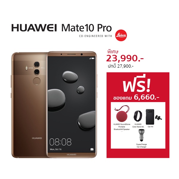 เรือธงตระกูลพรีเมียมอย่าง Huawei Mate 10 Pro ที่มาพร้อมกับจุดเด่นด้านดีไซน์จอไร้ขอบ และกล้องหลังคู่ผสานพลัง AI ที่พัฒนาร่วมกับแบรนด์ Leica ก็มีโปรโมชันพิเศษเช่นเดียวกัน โดยลดราคาค่าเครื่องพิเศษเหลือเพียง 23,990 บาท จากราคาเต็ม 27,900 บาท พร้อมรับของแถมสุดพิเศษมูลค่ารวมกว่า 6,660 บาท ประกอบไปด้วย ลำโพงบลูทูธไร้สาย Huawei SoundStone Portable Bluetooth Speaker, นาฬิกาอัจฉริยะ Huawei Color Band A2, อุปกรณ์สำหรับวางมือถือในรถ Car Kit และหัวชาร์จไวภายในรถ Huawei SuperCharge Car Charger พร้อมรับสิทธิ์ผ่อนชำระค่าเครื่องแบบ 0% และรับเครดิตเงินจากสถาบันการเงินที่ร่วมรายการ
