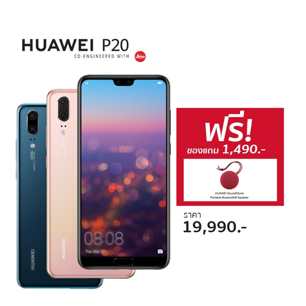 ด้าน Huawei P20 สมาร์ทโฟนเรือธงกล้องคู่ที่พัฒนาร่วมกับ Leica แถมยังได้รับคะแนนทดสอบจากสถาบันทดสอบชั้นนำอย่าง DxOMark ติดอันดับท็อป 3 ของโลก ก็มีโปรโมชันพิเศษเช่นเดียวกัน โดยผู้ที่ซื้อ Huawei P20 ในราคา 19,990 บาท จะได้รับของแถมพิเศษมูลค่ากว่า 1,490 บาท นั่นก็คือ ลำโพงบลูทูธไร้สาย Huawei SoundStone Portable Speaker พร้อมรับสิทธิ์ผ่อนชำระค่าเครื่องแบบ 0% และรับเครดิตเงินคืนจากสถาบันการเงินที่ร่วมรายการ นอกจากนี้ ภายในงานยังมี Huawei P20 สีพิเศษอย่างสีชมพู Pink Gold เข้ามาวางจำหน่ายด้วย