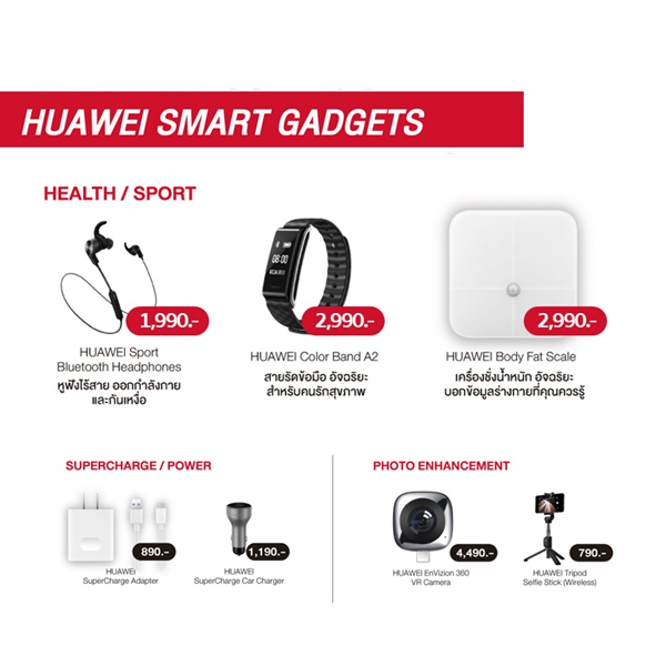- Health / Sport - อุปกรณ์เสริมสำหรับผู้ที่ชื่นชอบในการออกกำลังกาย ไม่ว่าจะเป็น หูฟังบลูทูธไร้สาย Huawei Sport Bluetooth Headphones ในราคา 1,990 บาท รวมถึงนาฬิกาอัจฉริยะ Huaewi Color Band A2 ในราคา 2,990 บาท