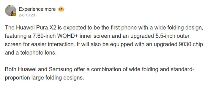 หลุดสเปก Huawei Pura X2 มือถือจอพับจอใหญ่ขึ้น 7.69 นิ้ว ใช้ชิป Kirin 9030 เพิ่มกล้อง Telephoto