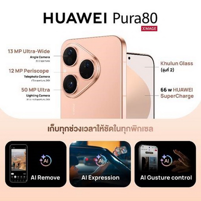 HUAWEI Pura 80 วางขายในไทย สมาร์ทโฟนกล้อง Ultra Chroma XMAGE สีสมจริง ดีไซน์หรู พร้อมชาร์จไว 66W