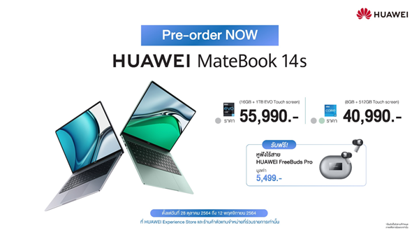 HUAWEI MateBook 14s วางจำหน่ายแล้ววันนี้ในราคาเริ่มต้นที่ 40,990 บาท พร้อมโปรโมชันพิเศษ รับฟรี หูฟังไร้สายระดับโปร HUAWEI FreeBuds Pro มูลค่า 5,499 บาท เมื่อสั่งซื้อสินค้าตั้งแต่วัที่ 28 ตุลาคม 2564 - 12 พฤศจิกายน 2564 ผ่านเว็บไซต์ HUAWEI Store รวมถึงร้านค้า HUAWEI Experience Store และร้านค้าตัวแทนจำหน่ายที่ร่วมรายการ สามารถดูรายละเอียดเพิ่มเติมได้ที่นี่ ส่วนทางด้าน HUAWEI nova 9, HUAWEI WATCH GT 3 Series และ HUAWEI Vision S ก็เตรียมเข้ามาวางจำหน่ายในประเทศไทยในเร็ว ๆ นี้