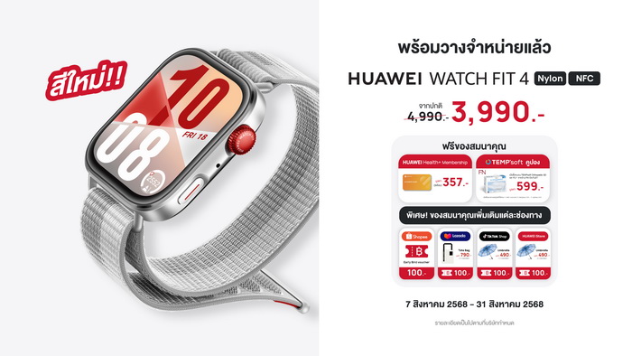 วางจำหน่ายทุกช่องทางออนไลน์แล้ววันนี้สมาร์ทวอทช์ HUAWEI WATCH FIT 4 สีเทา Nylon รองรับ NFC อย่างเป็นทางการแล้ววันนี้ มาพร้อมดีไซน์พรีเมียม สาย Nylon น้ำหนักเบา สวมใส่สบาย และฟีเจอร์เพื่อสุขภาพและการออกกำลังกายครบครัน ในราคาสุดพิเศษเพียง 3,990 บาท จากราคาปกติ 4,990 บาท ตั้งแต่วันที่ 7 สิงหาคม 2568 ถึง 31 สิงหาคม 2568 เท่านั้น