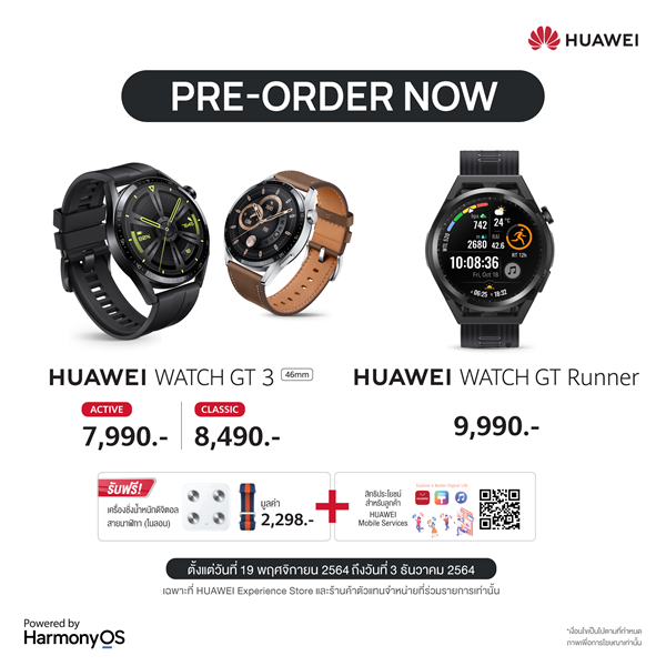 HUAWEI WATCH GT 3 Series เปิดให้สั่งจองแล้ววันนี้ โดยมาพร้อมกับโปรโมชันราคาพิเศษ และของสมนาคุณ เมื่อสั่งซื้อในช่วงพรีออเดอร์ระหว่างวันที่ 19 พฤศจิกายน 2564 ถึง 3 ธันวาคม 2564 เท่านั้น