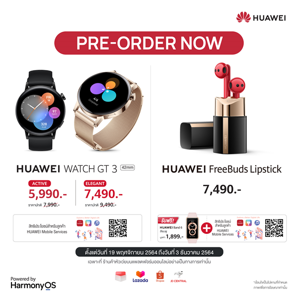 เรียกได้ว่าเป็นโปรโมชันที่ไม่ควรพลาดเป็นอย่างมาก สำหรับ HUAWEI WATCH GT 3 Series 42 มม. และ HUAWEI FreeBuds Lipstick สามารถสั่งจองได้ทางช่องทางออนไลน์ทั้งเว็บไซต์ HUAWEI Store และร้านค้าออนไลน์อย่างเป็นทางการของหัวเว่ยใน Shopee, Lazada และ JD Central เท่านั้น